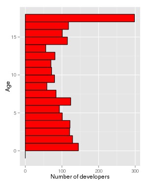 For example, in this pyramid for October 2009, you can see how at that time, those “18 quarters old” were almost 300 developers, while those coming to the project in the last quarter (July-September 2009) were like 150 developers.