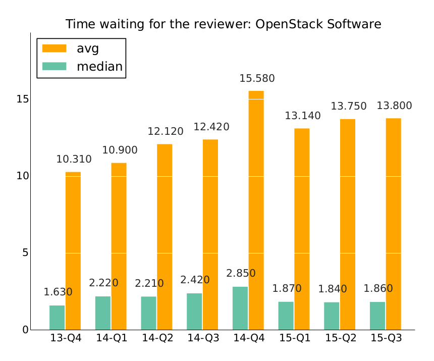 Indeed, this is also observed in the time to merge of the community. During the last quarter, a 50% of the changesets that landed into master were merged in less than 3 days since the review process was opened. These numbers are quite important for those companies doing continuous deployment to their customers. Having a stable number of days to merge and fix issues into code helps to work on internal policies related to the deployment of new features directly coming from the project.