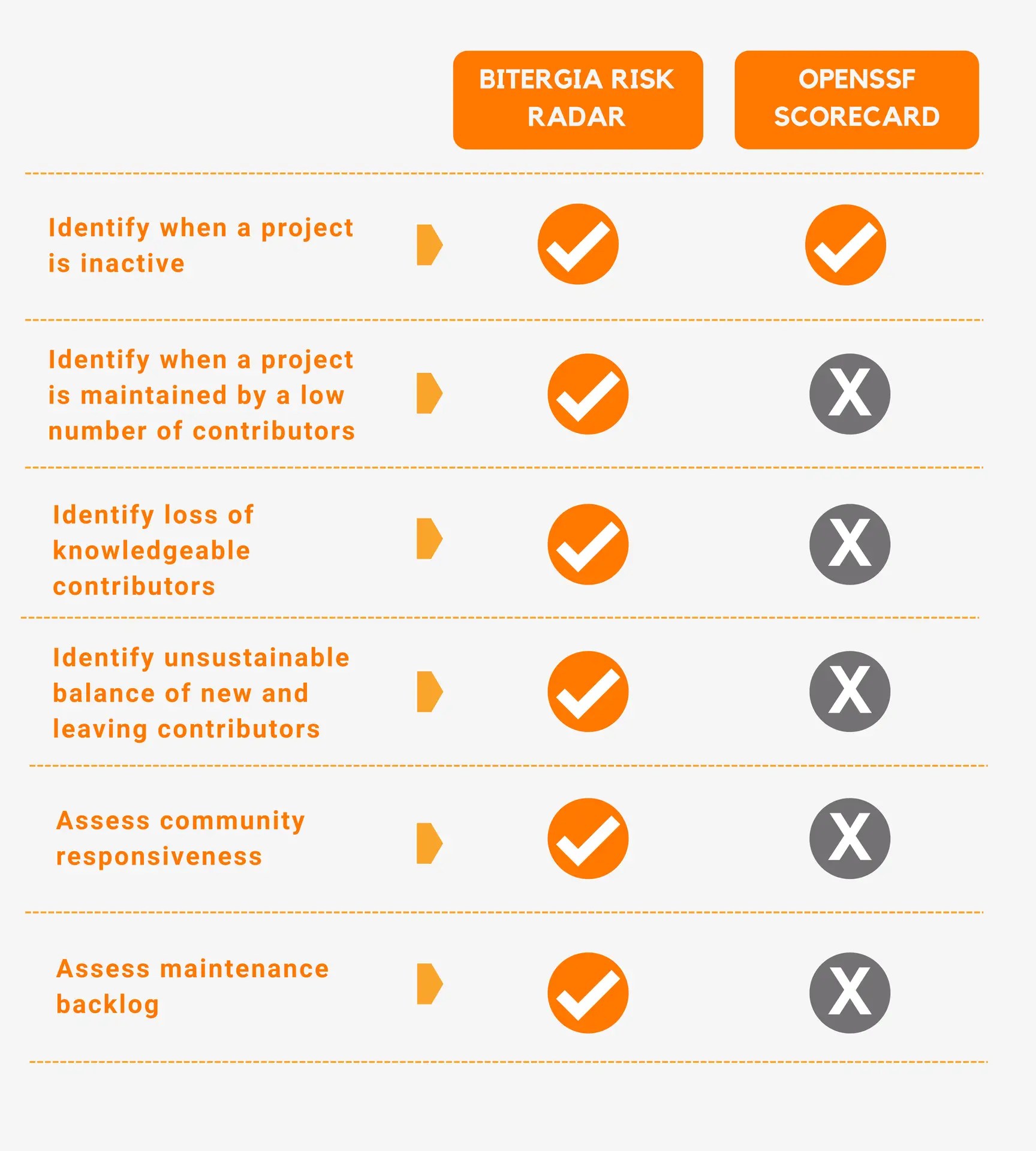 But what exactly are these tools, and how do they differ? More importantly, when should you choose one over the other? Let’s delve into the details and highlight some of the unique innovations of Bitergia Risk Radar.